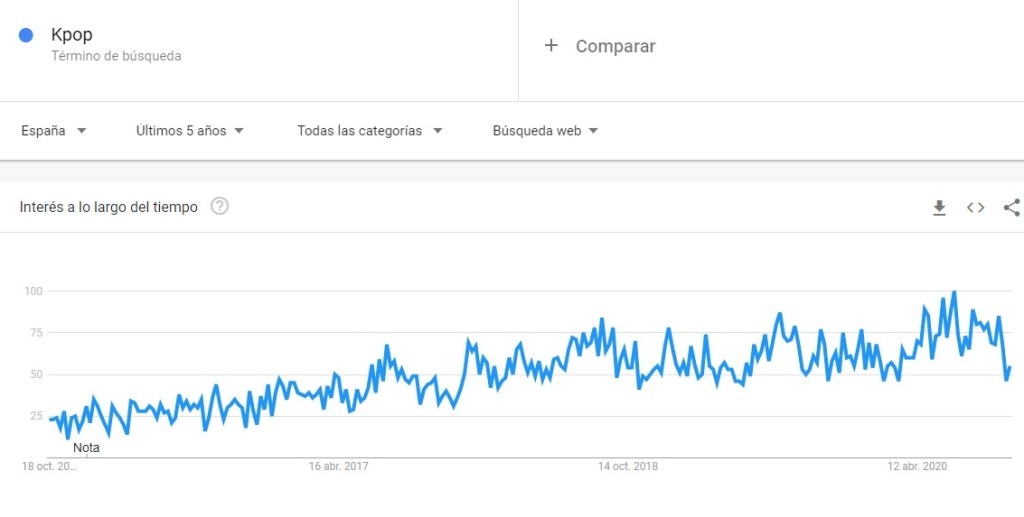 Prueba no sólo de su éxito sino de su expansión internacional, es que el interés por el k-pop ha sido creciente en España durante los últimos años. En la siguiente gráfica se puede ver la tendencia creciente y estable de búsqueda de este género en Google durante los últimos cinco años:
