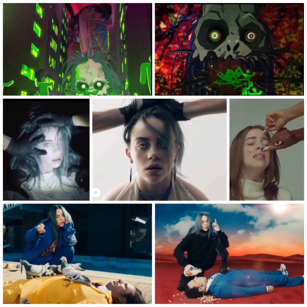 Los videoclips de Billie Eilish trabajan con el horror, la vejación y la distopía. Por eso aparece como poseída por el demonio con los ojos en blanco en el videoclip de ‘Bury a friend’, donde recuerda a la película El Exorcista, o encarna a una extraña criatura postapocalíptica en ‘All the good girls go to hell’ (ver carroussel):
